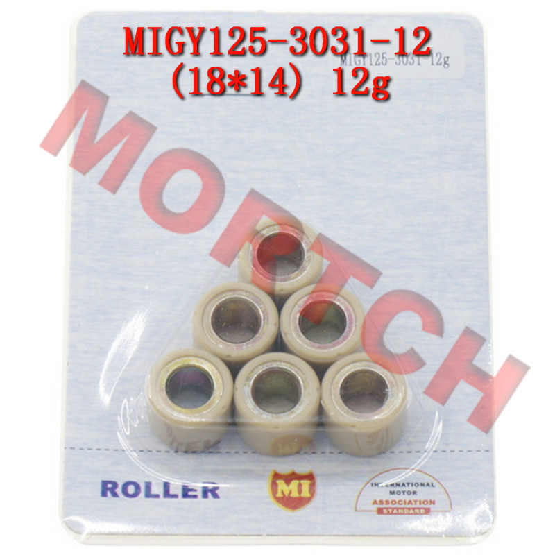 Here is an 18x14 mm roller set for the Genuine Buddy 125, Genuine Blur, and many other scooters. Buddy 125 takes 11.5 gram stock rollers, Kymco Movie 125 12.8 gram, Peugeot Speedfight 2 100 12.8 gram, PGO T Rex 125, G-Max 125 13 gram, G-Max 150 14 gram, SYM X Pro R1 125 10.1 gram, and Blur takes 14 gram stock, so play with some different weights and make it rip!