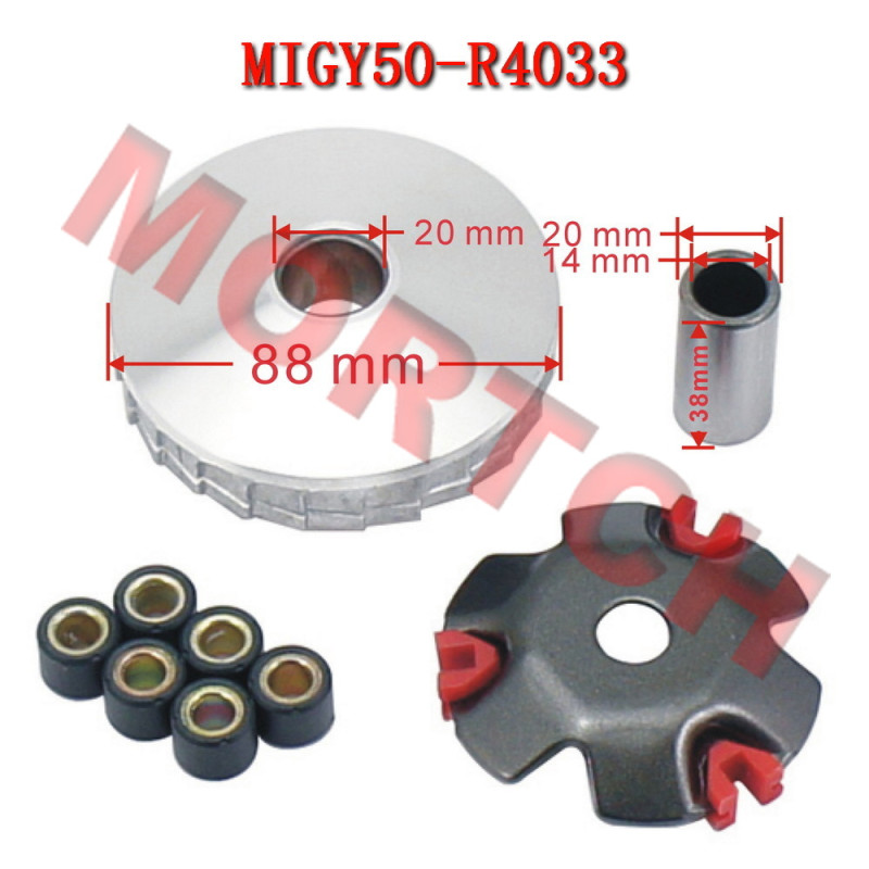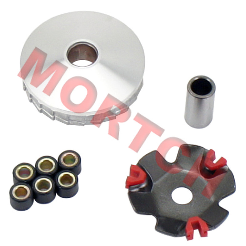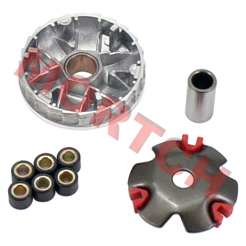 This is a High Quality High Performance variator for the GY6 50 and Honda Dio engine. This Variator kit also includes a set of Performance Roller/Sliders to make it a complete set. Sliders equalize the load pressure to reduce sticking and broaden the range of variations. You should also consider a new Gates Performance belt to complete the job properly.