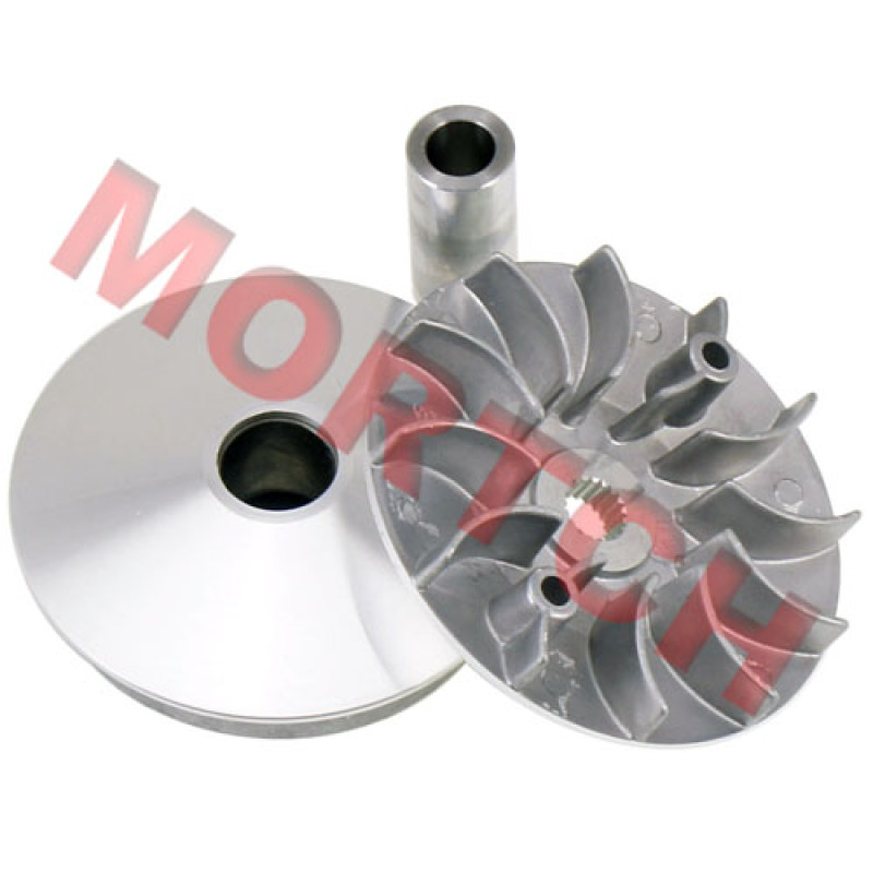 This variator for the various GY6 scooters contains all parts of the variator assembly, including pressure spring, slides, roller weights, pressure plate, and drive face.